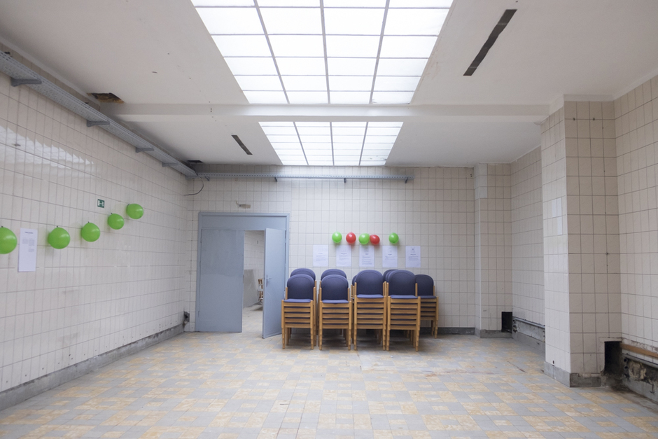 Quentin nous accompagne. Au mur, des ballons de baudruche de toutes les couleurs sont encore accrochés. Ce souvenir de la soirée de la veille égaye les carrelages blancs et froids du chantier. L’ambiance n’est pas encore aussi conviviale que dans le garage d’à-côté!